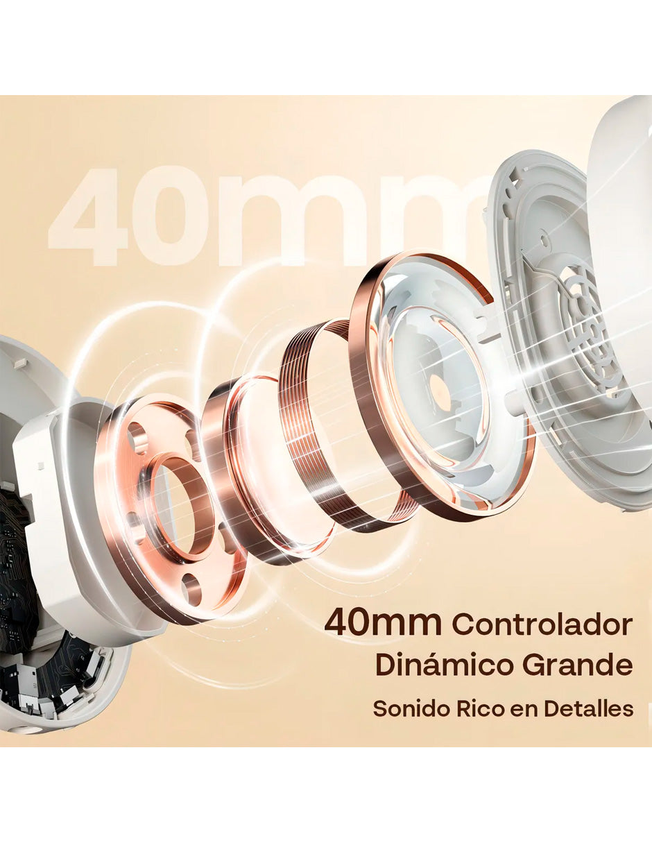 Gracias a su avanzada tecnología Bluetooth 5.4, la conexión es rápida, estable y con bajo consumo energético, ideal para sesiones prolongadas sin cortes ni interferencias. Su controlador dinámico de 40 mm entrega un sonido potente, equilibrado y envolvente, con graves profundos y agudos nítidos, para que cada detalle de tu partida o canción cobre vida.