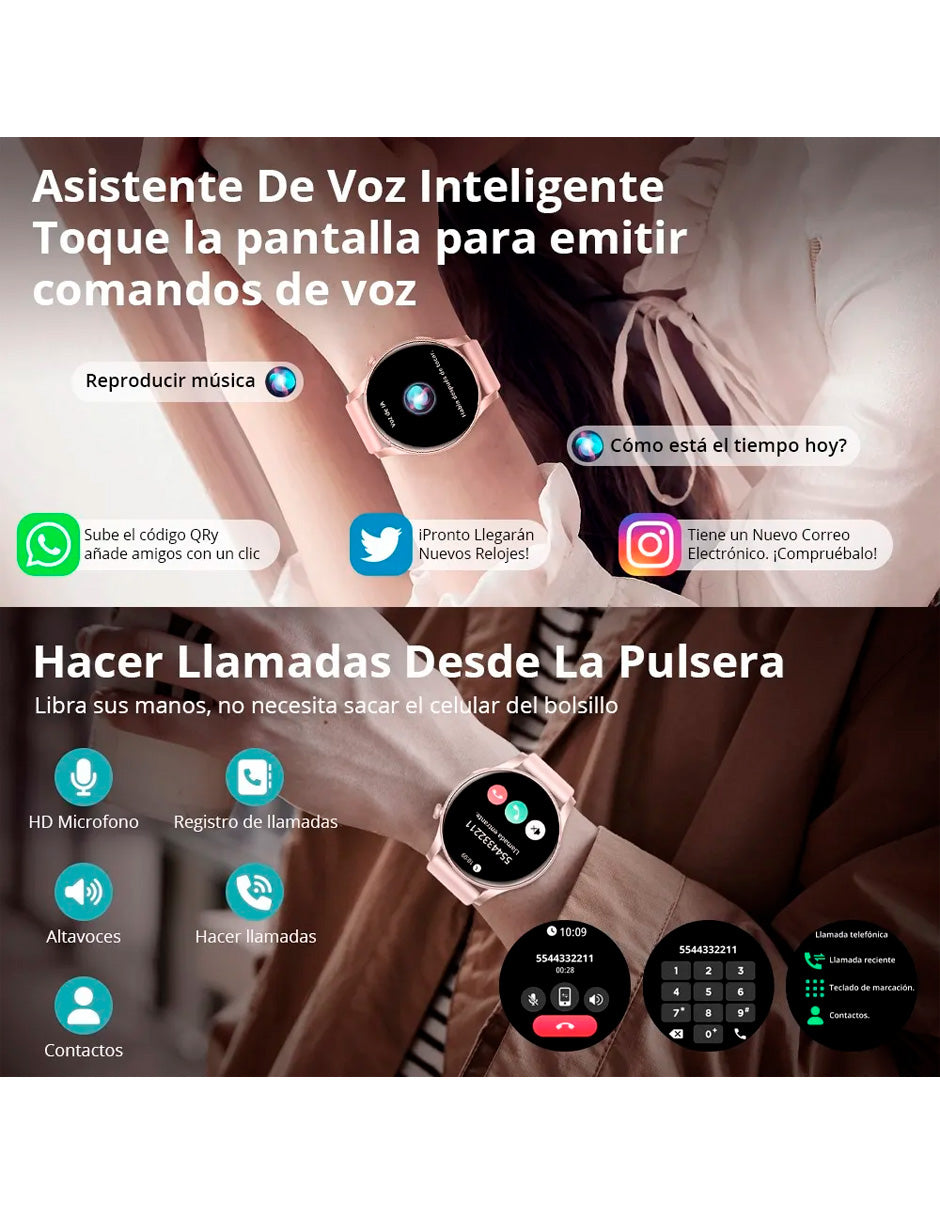 En el apartado de salud y bienestar, este smartwatch cuenta con monitor de ritmo cardíaco, medición de oxígeno en sangre, control de sueño, contador de pasos, calorías y distancia recorrida, además de múltiples modos deportivos para registrar con precisión tus entrenamientos. Su resistencia al agua te permite usarlo en distintas condiciones climáticas y actividades sin preocupaciones.